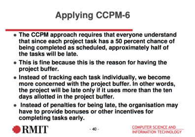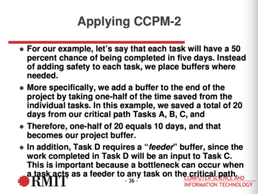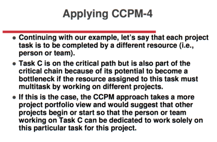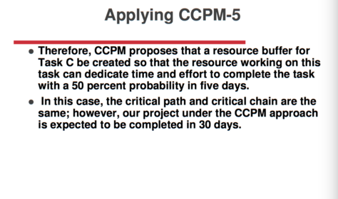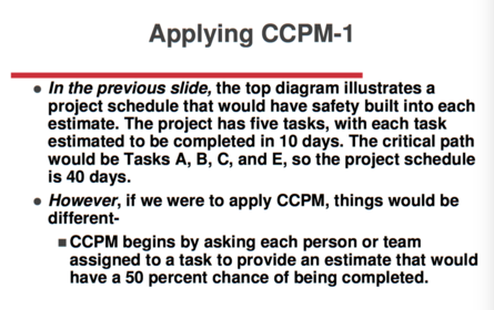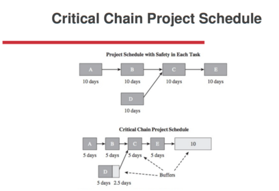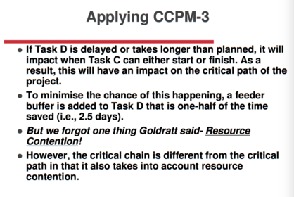 | Resource contention A third reason why safety does not ensure projects will be completed on time bc it has to do with multitasking of resource , called resource contention. - A project team member is often assigned more than one project. This person will be required to attend meetings, traiing, or be pulled off one project task to work on another -As a result, this person can become a constraint to the project because he or she is no longer able to devote time and energy to tasks on the critical path. Subsequently, the task takes longer, and so does the project. | - Goldratt's CCPM follows - Instead of adding safety to each task, put that safety in form of buffers where needed the most - This would be in the form of feeder buffers, resource buffers, and a buffer at the end of the project. |