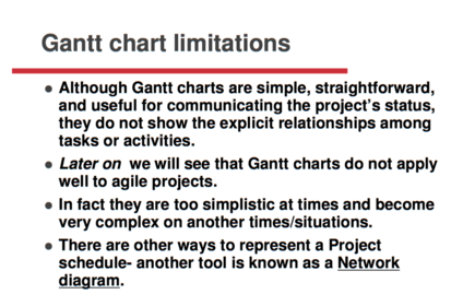 | Developing project schedule: - The WBS identifies the activites and tasks that must be completed in order to prvide project scope and deliverables - Estimates provide a forecasted duration for each of these activities. They are based on the characteristics of the activity, the resources assigned, and the support - Gantt chart can be used for planning. Estimates for the tasks or activities in the WBS are represented using a bar across a horizontal time axis | Different techniques for scheduling: 1. WBS and Gantt chart 2. Critical path analysis 3. Critical chain project management (CCPM) 4. PERT analysis 5. Precedence Diagramming method (PDM) |