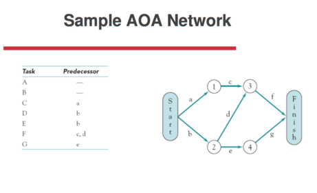 | Building the network: Two ways of displaying a project network: 1. Activties on arrows (AOA) network - the activities are shown as arrows and events as notes - Difficult to draw but show the technical relationship of the activities well 2. Activities on node (AON) network - Each task is shown as a node and the technological relationship is shown by the arrows AON network usaully associated with CPM AOA network usuaully associated with PERT | |