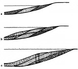 | a) Situation bei Beginn einer Transgression: Transgressionskonglomerat, gefolgt von Sandsteinen und Tonsteinen b) mit steigendem Meeresspiegel wird das Festland weiter überflutet, die Faziesbezirke rücken entsprechend nach c) Die einzelnen Fazies liegen in einem geologischen Profil nun übereinander | |
