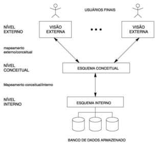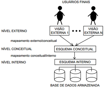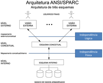 | Objetivo é separar o banco de dados físico das aplicações do usuário através de três diferentes níveis de esquemas. | Arquitetura ANSI/SPARC. Arquitetura de três esquemas.Nível Externo (de visões, lógico do usuário): Nível Conceitual (lógico de comunidade). Nível Interno (físico, de armazenamento). |