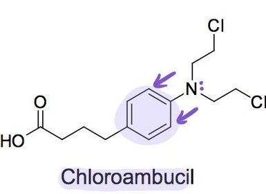 | Describe Chloroambucil | aromatic ring is electron withdrawing lowers nucleophilic strength of nitrogen much less reactive first step less reactive alkylating agent (lasts longer in vivo, more chance of reaching target) less side reactions and less toxic |