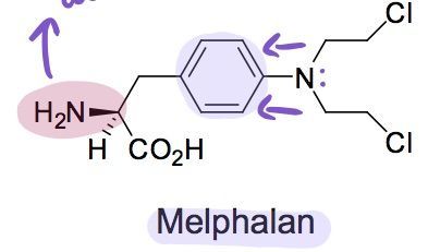 | Describe Melphalan | aromatic ring present less reactive alkylating agent mimics amino acid phenylalanine transported into cells by transport proteins |