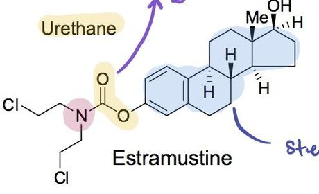 | Describe Estramustine | Urethane group is electron withdrawing Lowers nucleophilicity of nitrogen Alkylating group is attached to estradiol Steroid is hydrophobic - capable of crossing cell membranes |