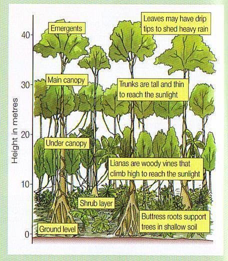| What are some adaptions of emergent? | Buttress roots to help stabilise, big leaves for the most sun, big branches to help support the massive leaves |