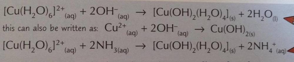 | Give the equations and colour change for the reaction between aqueous copper(II) ions and hydroxide ions/ammonia | pale blue --> blue preciptate |