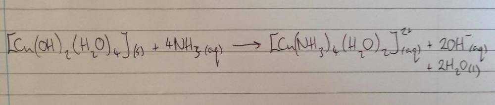 | Give the equation and colour change for the reaction between copper(II) hydroxide and excess ammonia | Blue precipitate --> deep blue |