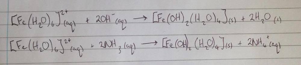 | Give the equations and colour change for the reaction between aqueous iron(II) ions and hydroxide ions/ammonia | pale green--> green precipitate (which darkens on standing as the precipitate is oxidised by water and oxygen in air to form iron(III) hydroxide |