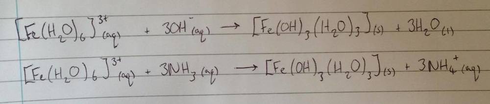 | Give the equations and colour change for the reaction between aqueous iron(III) ions and hydroxide ions/ammonia | Yellow --> orange precipitate that darkens on standing |