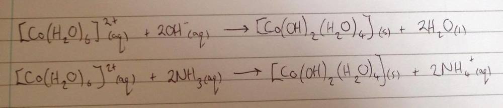 | Give the equations and colour change for the reaction between aqueous cobalt(II) ions and hydroxide ions/ammonia | Pale pink --> blue precipitate which turns brown on standing |