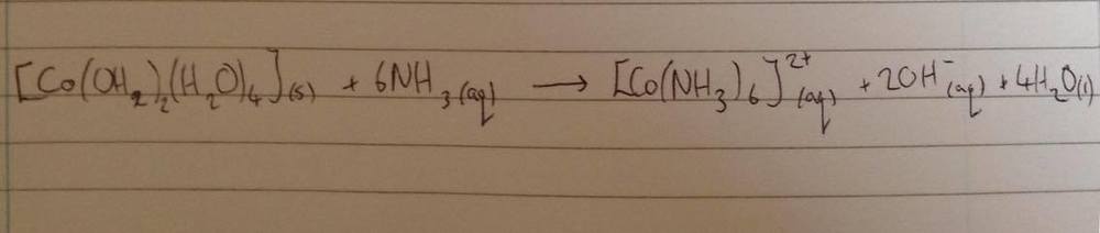 | Write the equation for adding excess ammonia to chromium hydroxide, name the type of reaction and give the colour change | [Cr(OH)3(H2O)3](s) + 6NH3(aq) --> [Cr(NH3)6]3+(aq) + 3OH-(aq) + 3H2O(l) Grey green to purple |