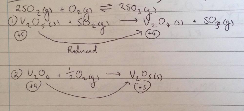 | What happens during the contact process? Include equations | A vanadium(V) oxide catalyst changes its oxidation state reversibly, first reducing to vanadium(IV) oxide as it oxidises sulfur dioxide to sulfur trioxide. Then oxidising back to vanadium(V) oxide by reacting with oxygen. |