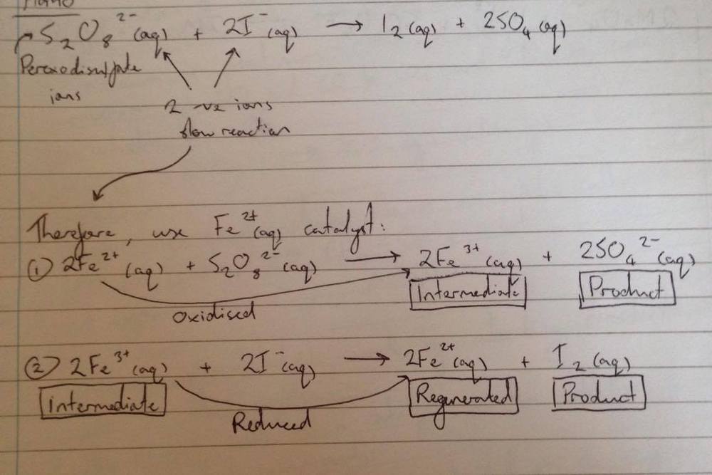| Describe what happens during the reaction between peroxodisulfate ions and iodide ions - include equations | As both ions are negatively charged, they are very unlikely to collide and react so and iron(II) catalyst is used. This gets oxidised by the peroxydisulfate ions to form iron(III) sulfate ions. The intermediate Fe(III) ions then oxidise the I- ions to iodine and the catalyst is regenerated. |