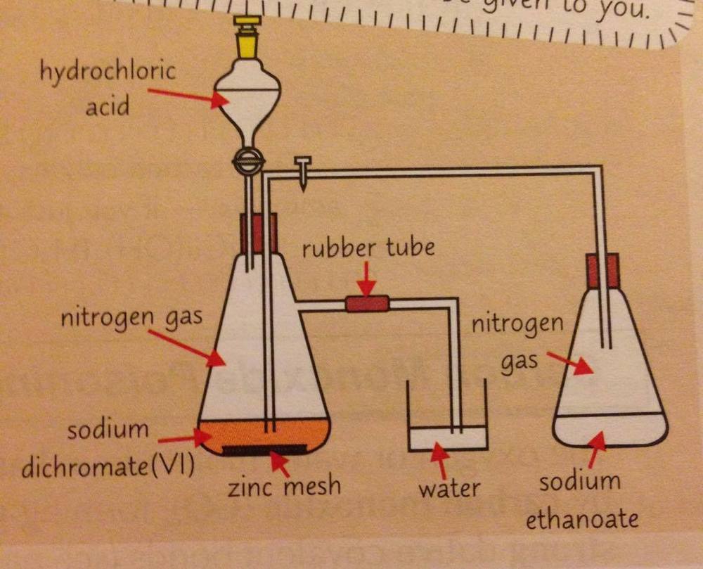 | What apparatus is used to prepare chromium(II) ethanoate? Describe how the procedure is carried out | 1) HCl is slowly added to a flask containing sodium dichromate and zinc mesh. The zinc will reduce the dichromate ions and react with the acid to produce H2(g), which escapes through the rubber tube. 2) As soon as the solution turns clear blue, the rubber tube is pinched shut so no more H2(g) can escape. 3) The build up of pressure in the flask will force Cr2+ solution through the glass tube into a flask of sodium ethanoate 4) A red precipitate of chromium(II) ethanoate will form 5) The precipitate is filtered and washed with water, then ethanol, then ether (while still keeping the solid in an inert atmosphere) |