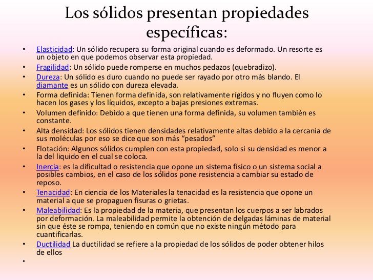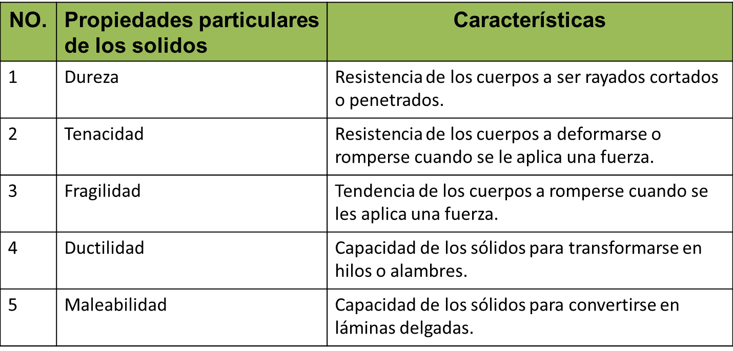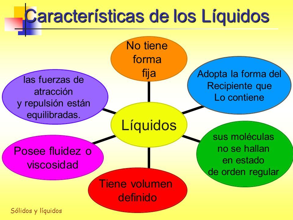Propiedades de los líquidos: Tensión superficial: es la cantidad de energía necesaria para estirar o aumentar la superficie de un líquido por unidad de área. Cohesión: la atracción intermolecular entre moléculas semejantes. Adhesión: la atracción entre moléculas distintas, como las del agua y un tubo de vidrio. Viscosidad: una medida de la resistencia de los líquidos a fluir. Estructura cristalina: estructura que posee un ordenamiento estricto y de gran alcance, sus átomos, moléculas o iones ocupan posiciones específicas.