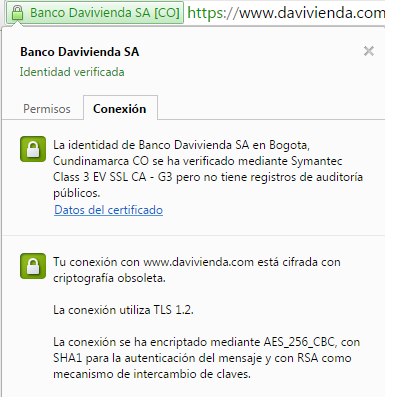 1. el protocolo SSL/TLS ha hecho su trabajo. Usando https Una vez que ambos conocen los parámetros de conexión, el sitio de davivienda presenta su certificado digital al navegador web para identificarse como un sitio confiable