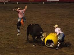 el trabajo del payaso es mantener a salvo el vaquero, para que no se quede pegado en el pretal o caiga y se lastimado por el toro