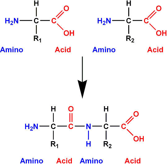 Ligação pepitidica - (H²N + OH) cria e libera H²O(Água)