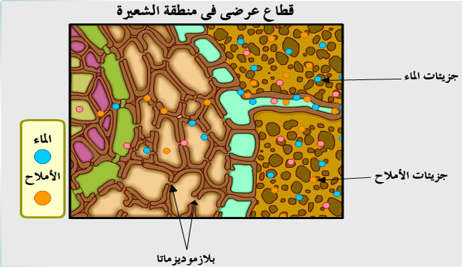 2. تنتقل جزيئات الماء من التربة ذات جهد الماء المرتفع إلى الشعيرات الجذرية ذات الجهد المنخفض بفعل الخاصية الأسموزية