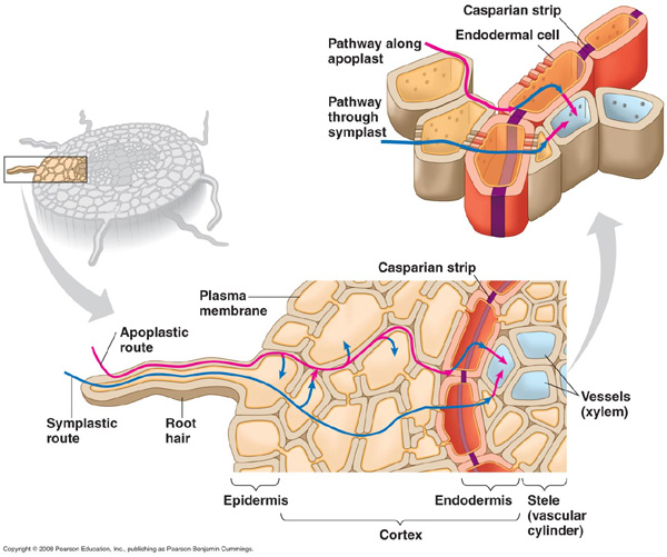 1. حيث تستمر خلايا الجذر في ضخ الأيونات إلى الخشب ,ويعمل شريط كاسبر على عدم عودة الأيونات خارج الإسطوانة فيؤدي تراكمها داخلها إلى تولد قوة تدفع الماء إلى الأعلى