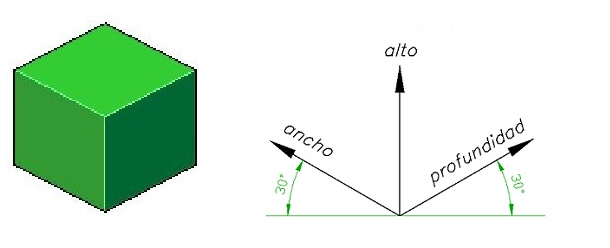 En un dibujo isométrico los ejes de ancho y profundidad tienen la misma inclinación, 30° respecto a la línea horizontal.