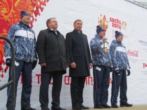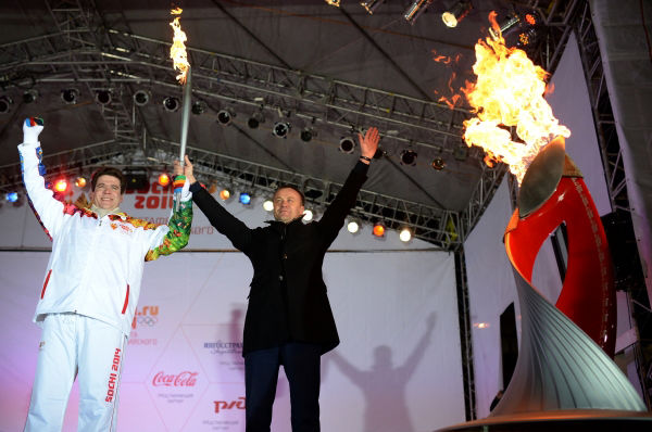 Площадь, сквер им. Кирова. Зажгли чашу Олимпийского огня - народный артист России Денис Мацуев и губернатор Иркутской области Сергей Ерощенко