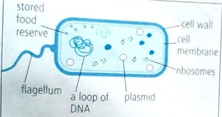 Consists of single cells. Each bacterial cell has cytoplasm surrounded by a cell membrane and cell wall, but has no nucleus. Has a loop of DNA in plasmids within cytoplasm. No chloroplasts or mitochondria. Some have extensions called flagella for moving through water or other fluids.