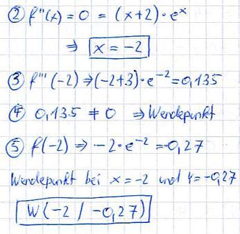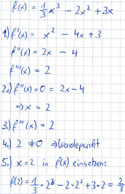 Wendepunkt berechnen: f''(x0) = 0 f'''(x0 ) ≠ 0 Wir leiten die Funktion f(x) dreimal ab. Wir setzen die zweite Ableitung Null und berechnen den X-Wert, sofern möglich Sofern möglich, setzen wir diesen X-Wert in die dritte Ableitung ein Ist dieses Ergebnis ungleich Null, liegt ein Wendepunkt vor Der X-Wert wird in f(x) eingesetzt, um den zugehörigen Y-Wert zu bestimmen Beispiel: