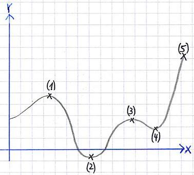 Minima und Maxima In der Extremwert-Rechnung unterscheidet man zwischen lokalen und globalen Maximas bzw. Minimas. Um dies besser zu verstehen, werft einen Blick auf die folgende Grafik: Die wichtigen Punkte wurden mit den Zahlen 1 bis 5 versehen. Diese schauen wir uns nun einzeln an: Bei (1) befindet sich ein Maximum. Genauer gesagt ist es ein lokales Maximum, denn es handelt sich hier nicht um den höchsten Punkt der dargestellten Funktion, sondern nur um den höchsten Punkt in der näheren Umgebung. Bei (2) findet sich ein lokales Minimum, denn dieser Punkt ist der tiefste Punkt in diesem Bereich. Da (2) jedoch auch den tiefsten Punkt der kompletten Funktion darstellt, ist (2) nicht nur ein lokales Minimum, sondern sogar ein globales Minimum. Bei (3) findet sich erneut ein lokales Maximum. Bei (4) findet sich ein lokales Minimum. Bei (5) findet Ihr das globale Maximum, denn es handelt sich um den höchsten Punkt der gezeichneten Funktion.