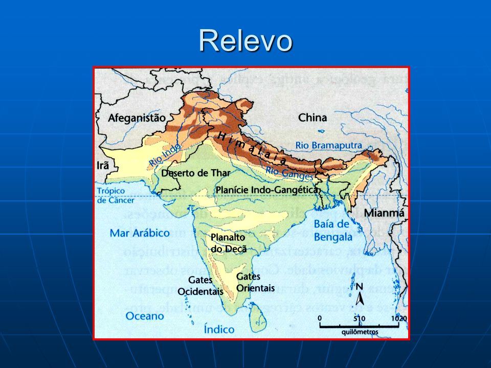 No interior do território indiano é possível identificar distintas condições de relevo e clima. Existem vários pontos do país que apresentam topografia acidentada, especialmente ao norte, lugar onde se estabelece a cordilheira do Himalaia, com altitudes sempre acima dos 6.000 metros. Além das montanhas, o território abriga características de relevo do tipo planalto e planície. A área do país, em sua maioria, está situada sobre o planalto do Decã, a oeste do mesmo são identificadas escarpas de altitude elevada, lugar denominado de Ghatts. As planícies se encontram entre a cordilheira do Himalaia e os planaltos e possuem terras com grande fertilidade. Na Índia é possível identificar basicamente dois tipos de climas: o seco e o chuvoso. Existem áreas, como o noroeste, nas quais os índices pluviométricos não ultrapassam os 500 mm ao ano, por outro lado, há regiões de grande umidade, provocada pelo fenômeno das monções que ocorrem na estação do verão.