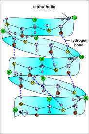 HELICE ALFA: -Disposición helicoidal de la cadena en zig-zag con grupos R hacia el exterior de la hélice -Estabilizada por puentes de H intercatenarios -La prolina desestabiliza la hélice alfa -Sentido de avance dextrógiro con 3,6 aminoácidos por vuelta-Proteinas fibrosas -Ej: Queratina