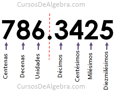 Valor posicional Para entender los números decimales primero tienes que conocer la notación.Cuando escribimos números, la posición (o "lugar") de cada número es importante.En el número 327: el "7" está en la posición de las unidades, así que vale 7 (o 7 "1"s), el "2" está en la posición de las decenas, así que son 2 dieces (o veinte) y el "3" está en la posición de las centenas, así que vale 3 cientos. Se puede comprender que los decimales están separados por una coma decimal, esta sirve para expresar su valor ya que en los números decimales se pueden encontrar decimos centésimos milésimos etc.