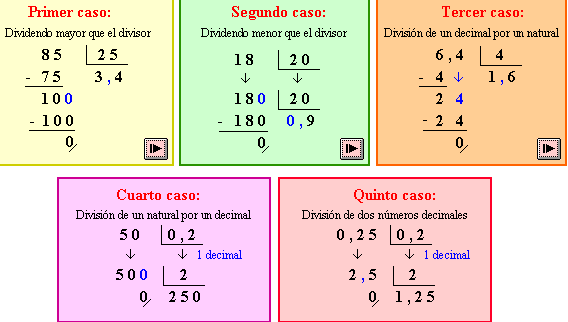 para la división decimal . Se quita la coma del divisor y se mueve la coma del dividendo hacia la derecha, tantas posiciones como decimales tenga el divisor. Primero quitamos la coma del divisor y como el divisor luego hay que mover la coma del dividendo por la cantidad de decimales posiciones. Hay que añadir tantos ceros como posiciones nos falten.