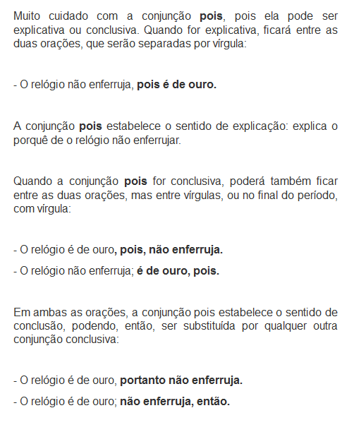 Exlicação: "Porque está subjacente uma dedução, uma hipótese por parte do locutor, e não um facto. As ruas estarem molhadas nunca poderia ser a causa de chover. As ruas até podem ter ficado molhadas, porque os funcionários da Câmara Municipal estiveram a lavar a rua durante a noite, por exemplo! Por conseguinte, uma oração causal exprime um facto; uma explicativa exprime uma dedução, uma conjectura."Logo:Oração Subordinada Adverbial Causal => Fato;Oração Coordenada Explicativa => Dedução