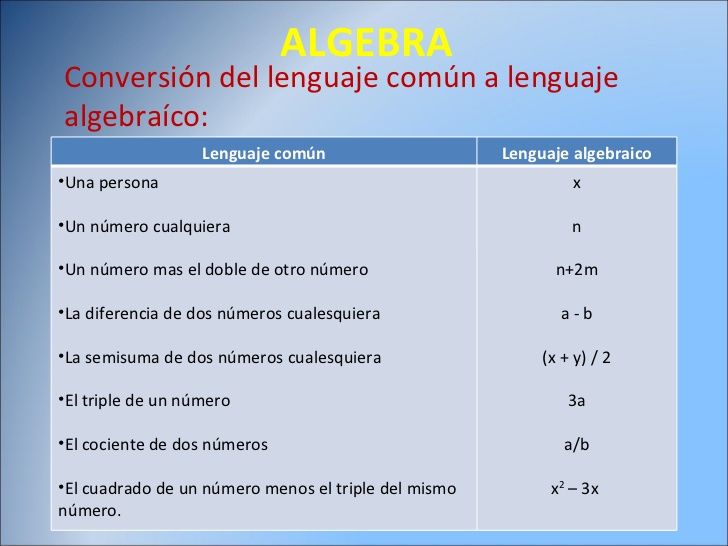 Lenguaje comúnEs aquel lenguaje en el cual tu dicen el término algebraico a través de palabras.Ejemplo: