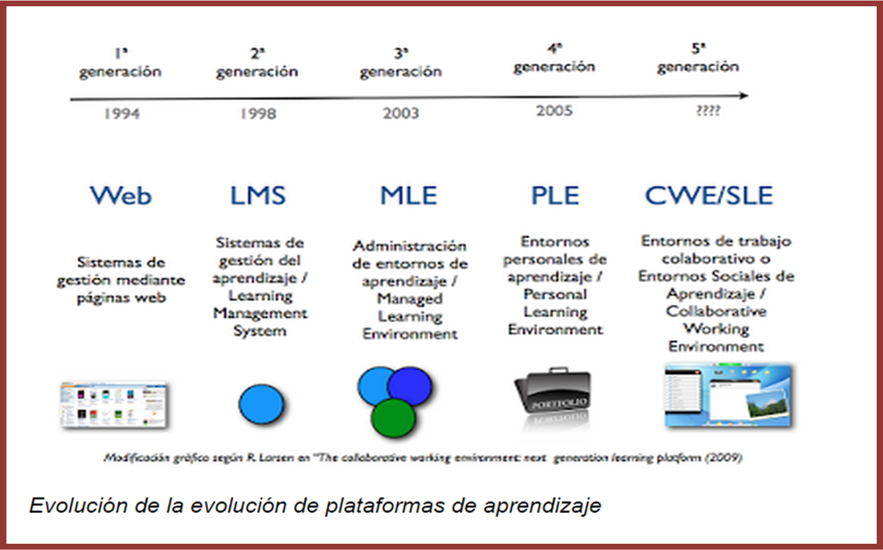 CARACTERÍSTICAS de los Entornos Virtuales de AprendizajeCentradas en la integración de herramientas y datos dentro de un contexto claro. Cursos divididos en Módulos. Aislamiento del aprendizaje en unidades relativamente pequeñas.Se establecen relaciones asimétricas. Dentro de los EVAs actuales, las capacidades de las herramientas de los profesores son superiores a las de los estudiantes. Esta asimetría envía un mensaje contradictorio a los usuarios: por un lado, se les exhorta a ser creativos, participar y tomar el control de su aprendizaje y, por otro, se limitan muchas de estas plataformas a un papel pasivo.Marco homogéneo. Todos los alumnos tienen la misma experiencia del sistema: el mismo contenido, organizado de la misma manera, con las mismas herramientas. Modelo similar a la educación clásica. (experiencia común de los estudiantes dentro de un contexto).Uso de estándares abiertos para el aprendizaje. Se ha aprobado un conjunto de especificaciones para los EVA a fin de integrarlos en los sistemas de direcciones (por ejemplo, IMS Enterprise Services) y para incorporar los materiales de aprendizaje empaquetados (por ejemplo, SCORM, IMS Content Packaging) y las evaluaciones (por ejemplo, IMS de preguntas y pruebas de interoperabilidad). Sin embargo no han impactado en los EVA otras especificaciones de adopción generalizada fuera de la educación.Control de acceso y gestión de derechos. Los EVA generalmente restringen el acceso al contenido a la cohorte. Esto va en contra del aprendizaje permanente, que trata de unificar las experiencias de aprendizaje. Ámbito de aplicación de la organización. El EVA organiza, instala y gestiona sin contar con los verdaderos actores, los estudiantes. Esto está en oposición a la formación permanente donde hay un papel importante para el aprendizaje entre la organización y el aprendizaje informal.Diseño alternativo para los espacios de aprendizaje personalizados:Centrarse en la coordinación de las conexiones entre el usuario y los servicios. No sólo se puede interactuar con las herramientas ofrecidas por el entorno. El PLE permite una amplia variedad de contextos y servicios ofrecidos por diversas organizaciones e individuos. Permitiendo integrar las experiencias en diversos entornos.Las relaciones simétricas. Cualquier usuario debería ser capaz de tanto consumir y publicar los recursos por medio de un servicio.Contexto individualizado. Los usuarios pueden reorganizar la información en el contexto a medida que lo ven en cualquier forma y elegir las herramientas adecuadas para ello.Trabajar con estándares abiertos de Internet y con los respectivos widgets y APIs modificables de poco peso. No debe centrarse únicamente en las normas elaboradas para satisfacer las necesidades del sector educativo.El contenido abierto y la cultura remix. A diferencia de los VLE, el PLE se refiere a la distribución de los recursos para la construcción de conocimiento colaborativo, con hincapié en el uso de las licencias Creative Commons. En lugar de objetos de aprendizaje pre-empaquetados. Ámbito de aplicación personal y global. Considerando que el VLE opera dentro de un ámbito de organización, el PLE opera a nivel personal, ya que coordina la información y los servicios relacionados directamente con el usuario. Imagen: Evolución de las Plataformas
