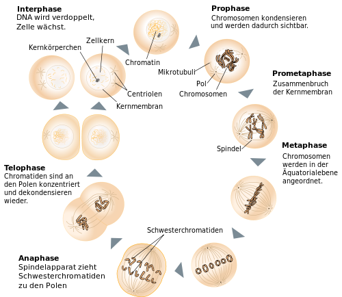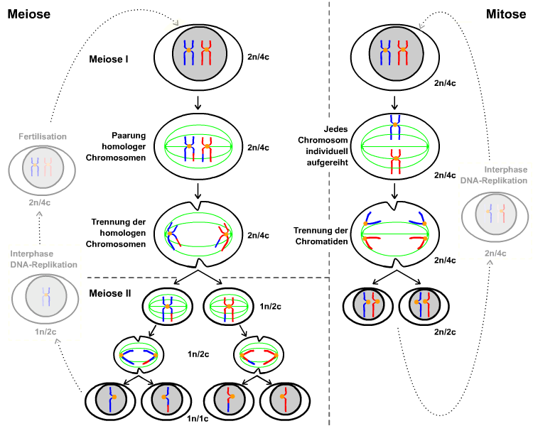 Vererbung Mitose und Zellzyklus-nicht geschlechtlich-Körperzellen=diploid-eine diploide Mutterzelle liefert zwei diploide Tochterzellen-Ergebnis zwei Tochterzellen, die die gleiche Chromosomen/Chromtidenanzahl haben wie die Mutterzelle (gleichmäßige Verteilung Erbinfo auf Tochterzellen)--> Tochterzelle genetisch identisch mit Mutterzelle-Zellzyklus-zuerst Interphase-G1-Phase: Wachstumsphase, Tochterzellen wachsen zur Größe der Mutterzellen heran-Stoffwechselerhöhung-Organellen-Vermehrung-jedes CHromosom besteht aus einem Chromatid-S-Phase: Synthese neuer DNA-Verdoppelung Erbsubstanz --> DNA Replikation-jedes Chromosom besitzt nun 2 Chromatide - G"-Phase Vorbereitung auf Mitose, eiteres Wachstum-Zelldifferenzierung-23 Chromosomen vom Vater, 23 Chromosomen von der Mutter, insgesamt 46 Chromosomen, von jedem Chromosom nun ein Chromatid-Mitose: Zelle soll wieder 46 Chromosomen bekommen, je ein Chromatid von jedem Chromosom,doppelter Chromosomensatz wird aufgeteilt -Prophase: DNA zu Chromosomen, werden sichtbar (Kondensiert), Chromosomen nicht stoffwechselaktiv, Chromosom besteht aus 2 Schwesterchromatiden (1 Chromatid und seine Kopie), die am Centromer verbunden sind, Kernhülle und Körperchen lösen sich auf, Spindelapparat bildet sich-Metaphase: Chromosomen wandern in Äquatorialebende, Centromere sind an den Mikrotubuli (Proteinfaser Spindelapparat)-Kernmembran wird vollständig aufgelöst-Anaphase: Chromosomenhälften (Chromatide) werden mithilfe Spindel-Mikrotubuli zu den Zellpolen/Centrosom transportiert, die Chromatide sind nun eigenständige Chromosomen, an jedem Zellpol befindet sich dan ein vollständiger Chromosomensatz-Telophase: Mutterzelle bereitet sich vor sich zu teilen-um getrennte Chromosomensätze neue Kernhüllen, Spindelapparat löst sich auf -Auf Äquatorialebende werden die Zellen getrennt,Chromosomen wickeln sich wieder ab-Cytokinese:-Pflanzen: Vesikel transportieren Wandmaterial zwischen die zwei Tochterzellen--> Neue Zellwand entsteht beim Verschmelzen der Vesikel-Tiere:Teilungsfurche, Zelle wird weiter eingeschnürt bis sich Mutterzelle in zwei Tochterzellen teilt-Nach Cytokinese können sich die Tochterzellen erneut teilenMeiose-geschlechtlich-Tochterzellen erhalten nur die Hälfte des genetischen Materials der Mutterzelle-Geschlechtszellen (Gameten): Spermien, Eizelle besitzen jeweils nur 23 Chromosomen/einen Chromosomensatz-Gameten=haploid-Zygote (befruchtete Eizelle) besitzt wieder 46 Chromosomen-Meiose soll aus diploider Zelle haploide Zellen machen-Meiose 1/1.Reifeteilung:-zuerst Interphase:Mutterzelle verdoppelt DNA und Organellen-Prophase 1: aufwickeln zu Chromosomen, Kernhülle und Kernkörperchen lösen sich auf, Spindelapparat entsteht, heftet sich an Chromosomen-Synapse: Zwei-chromatid-Chromosomen, die homolog sind heften sich aneinander--> es entsteht eine Tetrade aus 4 CHromatiden-Crossing over: Proteinfaserkomplex hält Tetraden zusammen, es kommt zu einem DNA-Stückaustausch zwischen den homologen Chromatiden, die Stränge brechen und werden kreuzweise wieder verbunden--> die Chromosomen tragen so ein Stück ihres homologen Partners in sich--> genetiche Vielfalt der Gameten wird erhöht, denn jedes Crossing over läuft anders ab--> genetische Info in Gameten ist somit nie die gleiche-Überkreuzungspunkte=Chiasmata-Neuordnung DNA=Rekombination-Metaphase 1: homologe Chromosomenpaare reihen sich nebeneinander in der Äquatorialebene auf-Anaphase 1: 1 Chromosom aus jedem homologen Chromosomenpaar wird an einen Pol transportiert, die Partner werden zufällig auf die Pole verteilt --> zweite Rekombination, an jedem Pol und später in jeder Zelle befindet sich so ein haploider Chromosomensatz-Telophase 1: Chromosomen lockern sich auf, die Kernhülle entsteht, Kernkörperchen werden wieder sichtbar, Spindelapparat löst sich auf-Zytokinese: aus diploider Mutterzelle nun zwei haploide Tochterzellen--> Zellteilung durch einschnüren der Zelle-Meiose 2/Reifeteilung 2: in jeder Zelle nun nur ein Chromosomensatz, zwischen Meiose 1 und 2 keine Interphase-Prophase 2: Zwei-Chromatidchromosomen verdichten sich, werden sichtbar, Kernehülle zerfällt, Spindelapparat wird gebildet, heftet sich an Chromosomen-Metaphase 2: Chromosomen ordenen sich auf Äquatorialebene an-Anaphase 2: Schwesterchromatide werden am Centromer getrennt und zu den Polen transportiert-Telophase 2: um Einchromatid-chromosmen entstehen Kernhüllen, Zellkerne werden gebildet, Chromatide entwirren sich, Spindelapparat löst sich auf-Zytokinese: Teilung der zwei Mutterzelle in jeweils zwei Tochterzellen-Mutterzelle war haploid, hatte einen Chromosomensatz mit jedoch 2-Chromatidchromosomen, Tochterzellen sind ebenfalls haploid, haben aber einen Chromosomensatz mit 1-ChromatidchromosomenMendelsche Regeln-Mendel erforschte Gesetzmäßigkeiten der Vererbung von Eigenschaften-einfacher Erbgang: Merkmal wird durch ein Gen vererbt-Versuche mit Gartenerbse-eindeutige Merkmale: runde und kantige Erbsensamen, keine Mischform, also reinerbig Uniformitätsregel:Kreuzt man zwei reinerbige Indiviuen einer Art, die sich in einem Merkmal unterscheiden, so sind deren Nachkommen in diesem Merkmal identisch-gleich ob das Merkmal vom Vater oder der Mutter stammt,alle Nachkommen sind also gleich, haben nur eines der beiden Merkmale Spaltungsregel:Kreuzt man Individuien der F1-Generation, so ist die F2 Generation nicht uniform/gleich, sondern spaltet sich in bestimmten Zahlenverhältnissen auf Unabhängigkeitsregel:Kreuzt man Individuen einer Art die sich in mehreren Merkmalen unterscheiden, so werden siede Merkmale unabhängig voneinander nach Uniformitäts- und Spaltungsregel vererbt Vererbung-dominant setzt sich durch--> groß Buchstabe-rezessiv gibt nach-Beispiel Rosen:-erste Generation ist homozygot ( 2 gleiche Allele für ein Merkmal/reinerbig): Rose 1hat Allele für rote Blütenfarbe, also ist ihr Genotyp (Erbbild des Organismus) RR und ihr Phänotyp (Erscheinungsbild) rot, Rose 2 hat Allele für eine wei