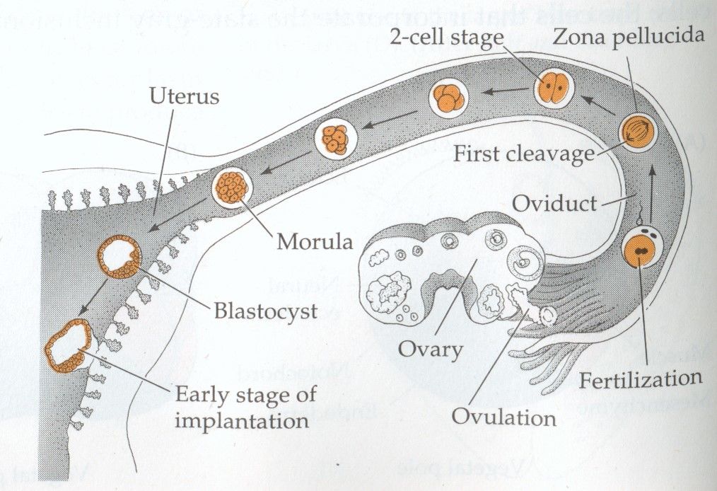 Forming the BlastocystAt the 32-cell stage the trophoblasts secrete fluid into the morular creating a blastocoel. The embryo is now called a blastocyst. By the 64-cells stage there is NO mixing between cells of the trophoblasts and cells of the inner cell mass. The blastocyst hatches from the zona pellucida after ~ 5 days and implants itselfs in the uterus. Fertilization occurs in the oviduct.