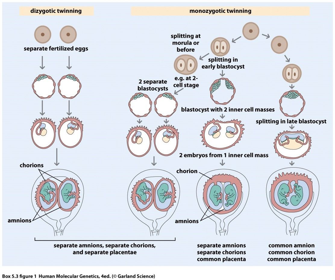 Internal and external Cells of the morulaBy the 16 cell-stage, the morula consists of a small group of internal cells surrounded by a larger groups of external cells. The external cells will become the TROPHOBLASTS (placenta food) that give rise to the placenta. Internal cells group at one pole to form the INNER CELL MASS that gives rise to the embryo, yolk sac, allantois and amnion. When the inner cell mass is isolated and cultured they give rise to embryonic stem cells which can become any cell type in the embryo proper.Whether a cell ends up in the inner cell mass or not depends on its position in the morula: cells on the inside become part of the inner cell mass.Allocation to the Inner Cell Mass:If you move a cell from the inside of one morula to the outside of another morula, it will become part of the trophectoderm of the second morula.