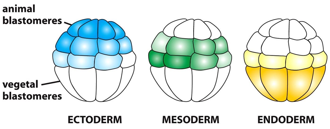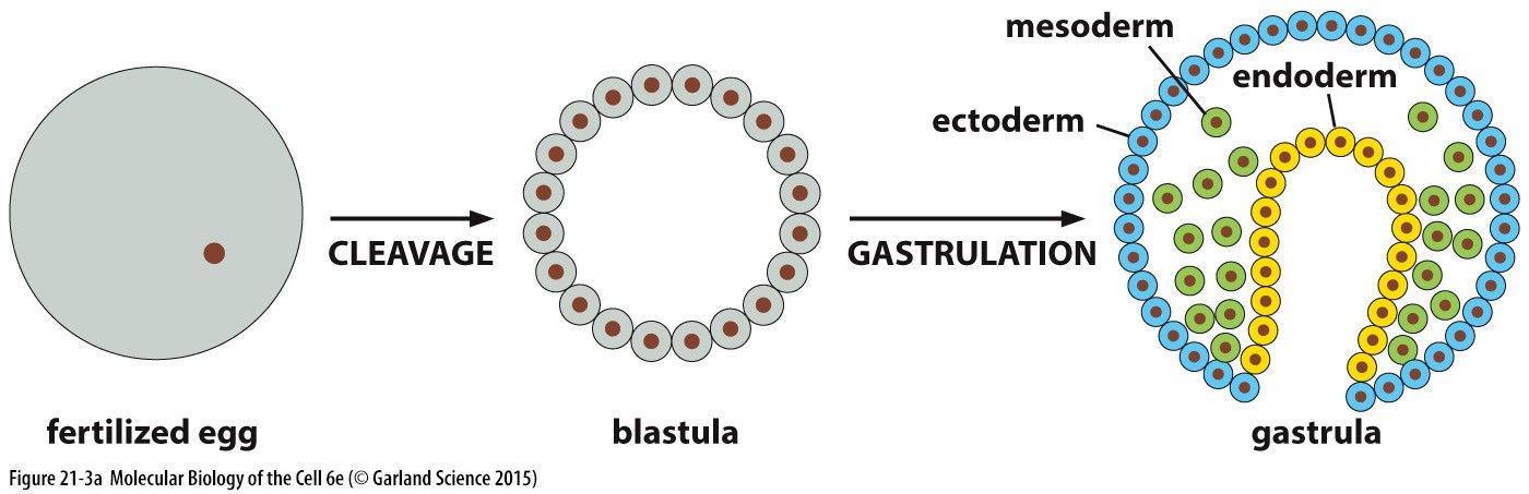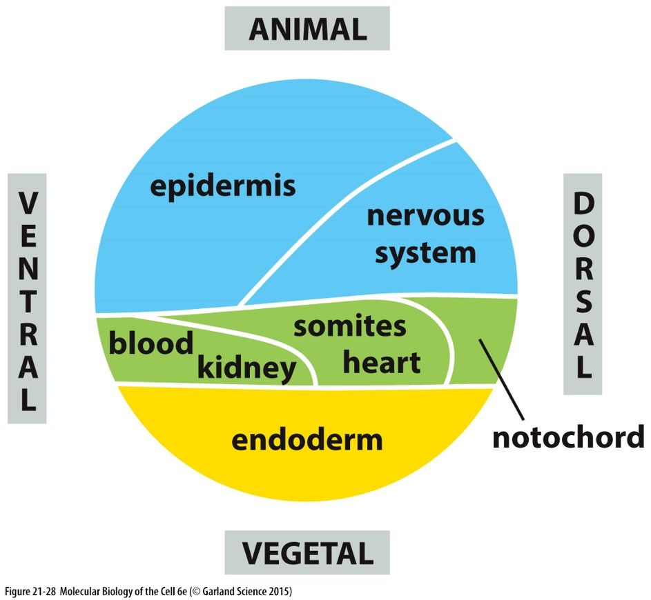 GastrulationIt is the cell movement that gives rise to: ectoderm, mesoderm and endoderm. The cells that will form the endodermal and mesodermal organs are brought inside the embryo. The ectodermal cells that will form the skin and nervous system are spread over the outside surface. The topology of gastrulation varies depending on whether the embryo starts as a spherical blastula((sea urchins and frogs) or sheets of cells (bird and mammals). The basic outcome of is the same with: Endoderm on the inside Mesoderm in the middle and ectoderm on the outside. Many of the genes and mechanisms are conserved.InitiationIn xenopus it is initiated at the future dorsal side of the embryo, just below the equator in the region of the gray cresent. This is the marginal zone where animal and vegetal poles meet, the vegetal cells have very little yolk. Steps: The prospective endodermal cells invaginate to form a slit like blastopore a the dorsal equator. At the dorasl lip of the blastopore, the sheet of deep marginal zone cells involutes. At the same time the animal cells spread as a unit to enclose the deeper layers of the embryo InvolutionThe inward movement of an expanding outer layer so that it spreads over the internal surface of the remaining external cells.The first cells to involute will form the most anterior endodermal and mesodermal cells, the last will form the posterior structures. The cells are patterned as they involute.