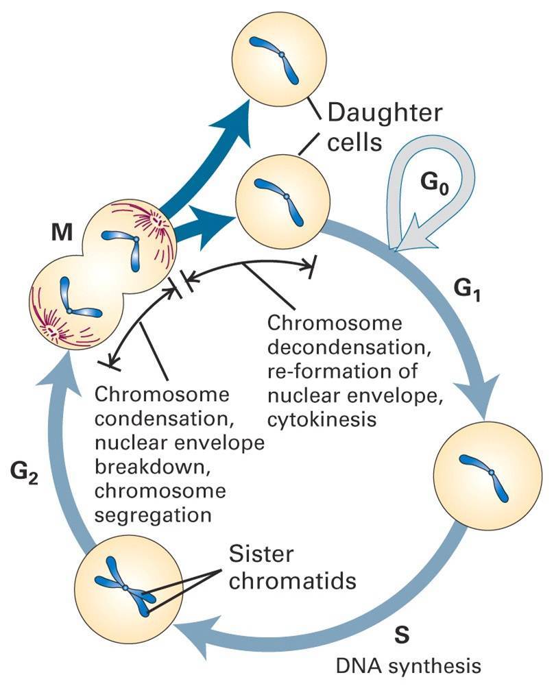 3. Second Growth Phase ( G2 ) This is a shorter growth phase, in which RNA and proteins necessary for cell division continue to be synthesized. Now, the cell is ready to start cell division and thus the cell cycle goes on.
