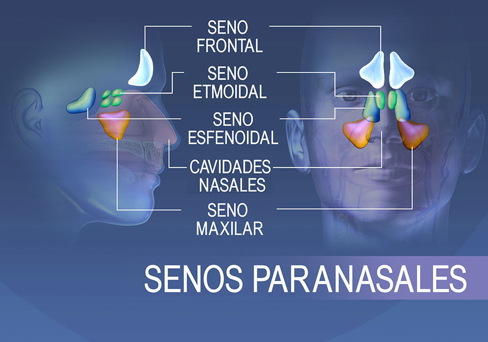 Los senos paranasales rodean las cavidades nasales Los senos paranasales son cuatro cavidades pares llenas de aire que se encuentran dentro de los huesos de la estructura ósea de la cabeza. Estos senos se denominan según los huesos de la estructura ósea de la cabeza que los contienen: frontal, etmoides, esfenoides y maxilar. Los senos paranasales están revestidos por mucosas que ayudan a calentar y humedecer el aire que inhalamos. Cuando el aire ingresa a los senos desde las cavidades nasales, el moco formado por las membranas mucosas drena a las cavidades nasales.