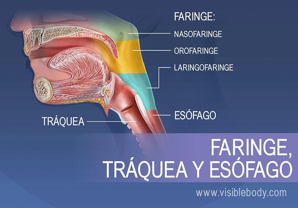 La faringe conecta las cavidades nasales y la bucal con la laringe y el esófago La faringe, o garganta, tiene forma de embudo. Durante la respiración, permite el paso de aire entre la laringe y la tráquea y las cavidades nasales y la bucal. La faringe incluye tres regiones: La nasofaringe es posterior a la cavidad nasal y funciona sólo como conducto para el paso de aire. La orofaringe es posterior a la cavidad bucal y contiene las amígdalas palatinas. Tanto el aire como los alimentos ingeridos pasan a través de la orofaringe y la laringofaringe que se encuentra por debajo. la laringofaringe se ubica posterior a la epiglotis y se conecta con la laringe (por arriba) y el esófago (por debajo). Cuando respiramos, la epiglotis permanece arriba y el aire pasa libremente entre la laringofaringe y la laringe.