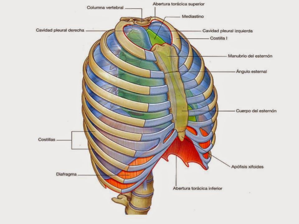 TóraxEs un cilindro de forma irregular con dos aberturas: una superior y una inferior.Cuenta con una cavidad y ésta está compuesta por el mediastino y cavidades pleurales izquierda y derecha.Funciones:Respiración, protección, conducción.Dentro de los componentes del tórax se encuentran: pared tóracica, aberturas toracicas, tanto la inferior como la superior, diafragma, y mediastino, con sus respectivos limites cada uno.