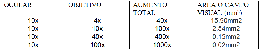 1) Realice una tabla en la cual aparezca el área o campo visual que obtiene con cada uno de los objetivos.
