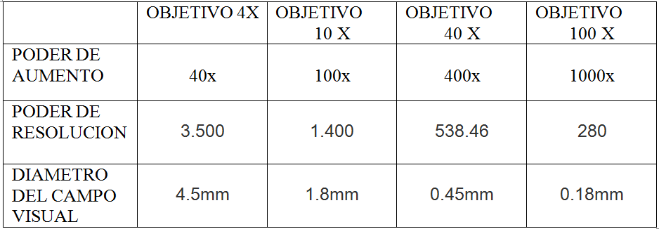 Marco Teórico1.- Poder de aumento: Es la capacidad del microscopio que expresa la razón entre el tamaño de la imagen que produce el microscopio y el tamaño del objeto observado. Como el microscopio tiene dos sistemas ópticos, cada uno de ellos es capaz de agrandar la imagen, el aumento total es igual al producto de los aumentos dados por el ocular y el objetivo respectivamente. 2.- Poder de resolución: Es la capacidad del instrumento de dar imágenes bien definidas de puntos situados muy próximos entre si. 3.- Límite de resolución: Es la distancia mínima que puede existir entre dos puntos para que puedan ser definidos como tales. Es importante recordar que el limite de resolución es la inversa del poder de resolución de manera que cuanto mayor es el poder de resolución, menor es el limite de resolución. 4.- Poder de definición: Consiste en la capacidad de dar imágenes claras de contornos precisos. Reside en la corrección de las aberraciones propias de las lentes.5.- Poder de penetración: Así como el poder de resolución permite averiguar detalles colocados a la misma altura, el poder de penetración permite averiguar hasta que límite, detalles de estructuras situadas en diferentes planos, realmente están a niveles distintos con un mismo enfoque.