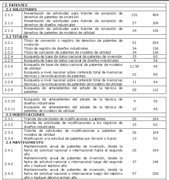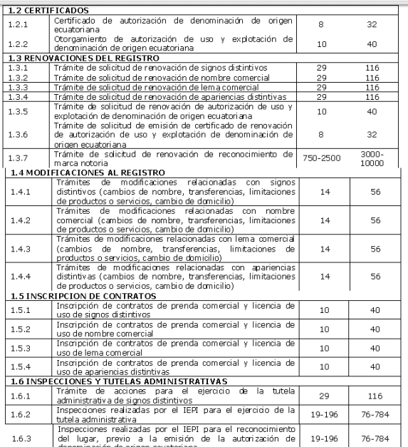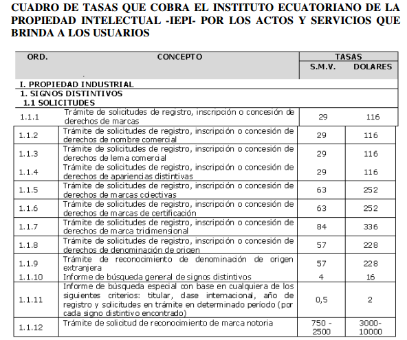 PROCEDIMIENTOPara la marca:PROCEDIMIENTO DE REGISTRO Presentada la solicitud, pasa a un examen de forma, revisando que cumpla con todos los requisitos, de ser así se publica en la Gaceta de Propiedad Industrial, con la finalidad de que terceros tengan conocimiento de las peticiones efectuadas. Si no existe oposición, se efectúa el examen de registrabilidad para la posterior emisión de la resolución que acepta o rechaza el registro y en caso de concesión, el trámite concluye con la emisión del título de registro. PATENTE A continuación presenta un organigrama a seguir para la obtención de la patente. Protege el Derecho de Autor El Derecho de Autor protege la obra por el solo hecho de su creación. Sin embargo, es recomendable registrar la obra en la Unidad de Registro del IEPI, así el autor se beneficiará de la presunción de autoría que la ley reconoce a su favor. La protección del Sistema de Derecho de Autor se basa en la potestad de autorizar o prohibir el uso de su obraEl plazo de vigencia de la protección se da sin prejuicio de derechos morales que se protegen indefinidamente IEPI on-line:1. Para iniciar el proceso es necesario ingresar a la opción de “solicitudes en línea”, luego se abre la opción para crear un “casillero virtual”. Al abrirlo, se desplegará un pequeño formulario para crear un casillero. 2. Una vez que se tiene creada la cuenta de casillero virtual, debe ingresarse con el nombre de usuario y contraseña registrados en el paso anterior. 3. Entonces, se puede iniciar el proceso de solicitud en línea. A continuación se desplegará un menú con varias opciones. Para el este ejemplo, elegimos “registro”. 4. Al dar clic sobre la opción registro se desplegará un mini menú con los tipos de registros que pueden solicitarse, como por ejemplo, signos distintivos, patentes, obtenciones vegetales, derechos de autor, etc. 5. Para registrar un signo distintivo se abrirá un formato único de signos distintivos, el usuario deberá llenarlo casilla por casilla, completando los datos e información solicitados. El formulario permite guardar la información ingresada para completarla después o modificarla, en caso de existan errores. Cuenta también con le opción de “vista previa” para visualizar el formulario completo antes de enviarlo al IEPI. En la última casilla (Anexos) el sistema solicitará adjuntar una copia escaneada de la cédula de identidad del solicitante. 6. Una vez revisado y guardado el formulario, la información se almacenará en el casillero virtual, desde donde el usuario podrá consultar el estado de sus solicitudes, tal como se observa en el siguiente recuadro. 7. Una vez revisado y guardado, el formulario se visualizará en formato PDF y se generará un comprobante de pago que el usuario deberá imprimir para cancelar el valor correspondiente en el Banco del Pacífico, que es la entidad recaudadora del IEPI. 8. Finalmente, el usuario deberá escanear el comprobante de pago emitido por el Banco del Pacífico y cargarlo en el sistema del IEPI. Para hacerlo, deberán ingresar en la opción “iniciar proceso”, registrar el número de comprobante y cargarlo. Quienes trabajen con un representante legal o un apoderado, deberán registrar la información de su representante o apoderado, según lo solicita el formulario correspondiente. 9. En cuanto la solicitud sea ingresada, se enviará automáticamente al IEPI e iniciará el trámite correspondiente.Linkografia:http://www.propiedadintelectual.gob.ec/tasas/http://www.propiedadintelectual.gob.ec/wp-content/uploads/2013/08/reformas_tasas_2013.pdfhttp://www.lacamaradequito.com/uploads/tx_documents/FIJACI_N_DE_TASA_POR_SERVICIOS_DEL_IEPI_EN_SALAR...http://www.propiedadintelectual.gob.ec/tasas/
