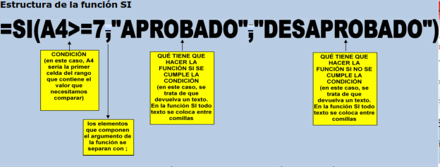 Utiliza la sintaxis =si prueba lógica (es la expresión a evalura) o de acuerdo esta se pueden encontrar dos resultados: un VALOR SI VERDADERO o un VALOR SI FALSO. Esta funcion se usa para realizar pruebas condicionales que pueden ser valores o fórmulas. Además de eso permite evaluar condiciones y devuelve otro valor