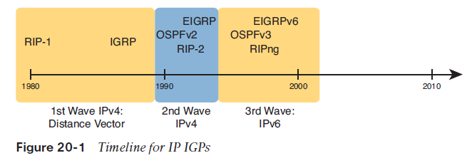 Routers and Layer 3 switches add IP routes to their routing tables using three methods: connected routes, static routes, and routes learned by using dynamic routing protocols.Introduction to Routing ProtocolsEach routing protocol causes routers (and Layer 3 switches) to1. Learn routing information about IP subnets from other neighboring routers2. Advertise routing information about IP subnets to other neighboring routers3. Choose the best route among multiple possible routes to reach one subnet, based on that routing protocol’s concept of a metric4. React and converge to use a new choice of best route for each destination subnet when the network topology changes—for example, when a link failsHistory of Interior Gateway Protocols Historically speaking, RIP Version 1 (RIPv1) was the first popularly used IP routing protocol, with the Cisco-proprietary Interior Gateway Routing Protocol (IGRP) being introduced a little later, as shown in Figure 20-1.