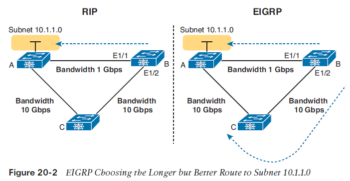 The routers use their own independent hello interval, which defines the time period between each EIGRP hello. For instance, routers R1 and R2 do not have to send their hellos at the same time. Routers also must receive a hello from a neighbor with a time called the hold interval, with a default setting of three times the hello interval.For instance, imagine both R1 and R2 use default settings of 5 and 15 for their hello and hold intervals. Under normal conditions, R1 receives hellos from R2 every 5 seconds, well within R1’s hold interval (15 seconds) before R1 would consider R2 to have failed. If R2 does fail, R2 no longer sends hello messages. R1 notices that 15 seconds pass without receiving a hello from R2, so then R1 can choose new routes that do not use R2 as a next-hop router to send a frame over the link. Both bandwidth and delay are settings on router interfaces; although routers do have default values for both bandwidth and delay on each interface, the settings can be configured as well.EIGRP calls the calculated metric value the composite metric, with the individual inputs into the formula being the metric components.■ A smaller bandwidth yields a larger composite metric because less bandwidth is worse than more bandwidth.■ A smaller delay yields a smaller composite metric because less delay is better than more delay.EIGRP ConvergenceAnother compelling reason to choose EIGRP as an IGP has to do with EIGRP’s much better convergence time as compared with RIP. EIGRP converges more quickly than RIP in all cases, and in some cases, EIGRP converges much more quickly.With EIGRP, those same worst cases typically experience convergence of less than a minute, often less than 20 seconds, with some cases taking a second or two.EIGRP does loop avoidance completely differently than RIP by keeping some basic topological information. The EIGRP topology database on each router holds some information about the local router, plus some information about the next-hop router in each possible route for each known subnet. That extra topology information lets EIGRP on each router take the following approach for all the possible routes to reach one subnet:■ Similar to how other routing protocols work, a local router calculates the metric for each possible route to reach a subnet, and chooses the best route based on the best metric.■ Unlike other routing protocols, the local router uses that extra topology information to look at the routes that were not chosen as the best route, to find all alternate routes that, if the best route fails, could be immediately used without causing a loop.